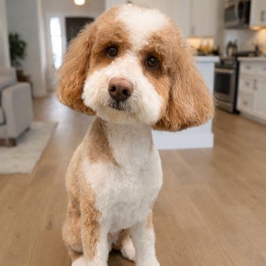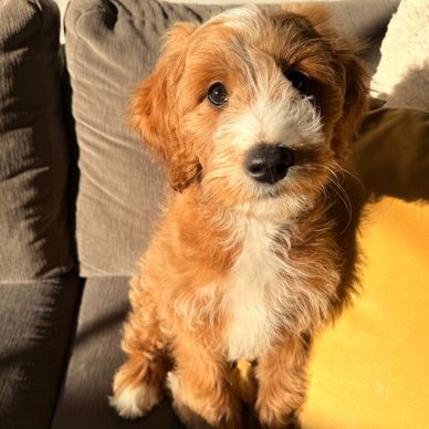 River is our prospective up coming stud for our program in 2027. He has a beautiful teddy bear brown, wavy non-shedding coat. River is a brave, outgoing pup who loves to learn and is very people driven. He flew to us from AB and was sleeping on his back legs up in the air while on his flight! Silly boy. We expect River to mature around 18" at the shoulder and weigh 25-30lbs.