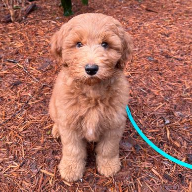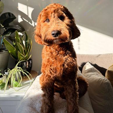 Fenn is our new prospective Mom. She is a confident, vivacious girly who is always up for a new adventure. She absolutely adores children and people. Fenwick loves car rides, boating, paddle boarding, the beach and anything in the woods. Fenwick is 18 1/2" at the shoulder and around 28lbs. She's a small medium multigenerational goldendoodle with a beautiful intense red coat that's fully furnished (genetically non-shedding). Fenwick will complete all her health testing Spring of 2026. We look forward to welcoming her first litter in the fall.